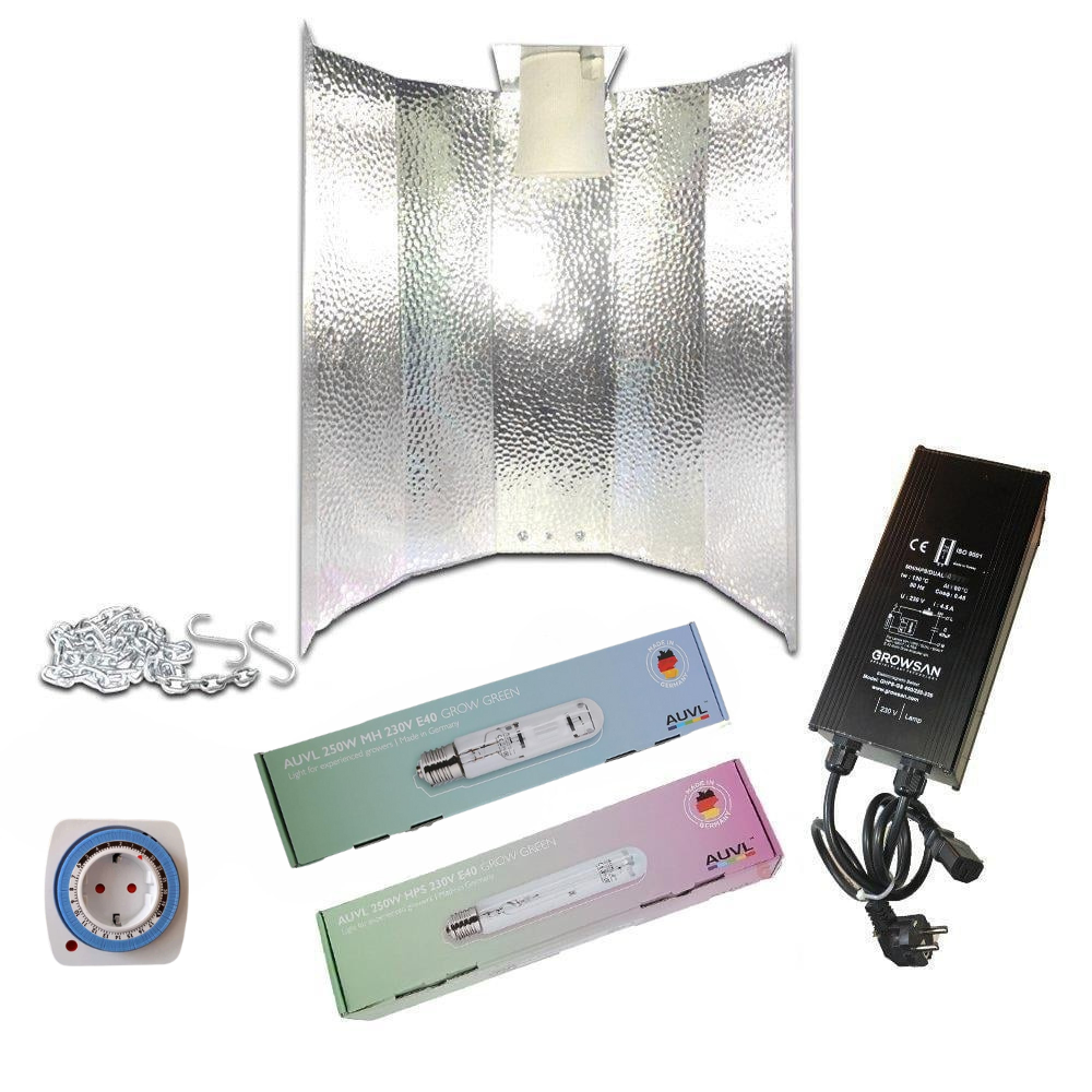 Çalışma Prensibi: Bu set; lamba, balast, reflektör, mekanik zaman saati ve aski zincileri ile kancalardan oluşan tam ve yüksek fonksiyonlu 250w yetiştirme lambası setidir. Balast ana akım elektrik gücünü doğru voltaj değerine optimize ederek lambanın çalışmasını sağlamaktadır. Yetiştirme lambası elektrik gücünü yetişmekte olan bitkiler için uygun ışık spektrumuna dönüştürmektedir. Lambayı tutmakta olan reflektör ise, lambanın ortaya çıkardığı ve kendisine yansıttığı ışık spektrumunu tekrar yetiştirme ortamına yansıtmak suretiyle bahçe verimliliğinizi arttırmaktadır. Zira reflektörden geri yansıyan ışık bitki tarafından kullanılabilecektir.