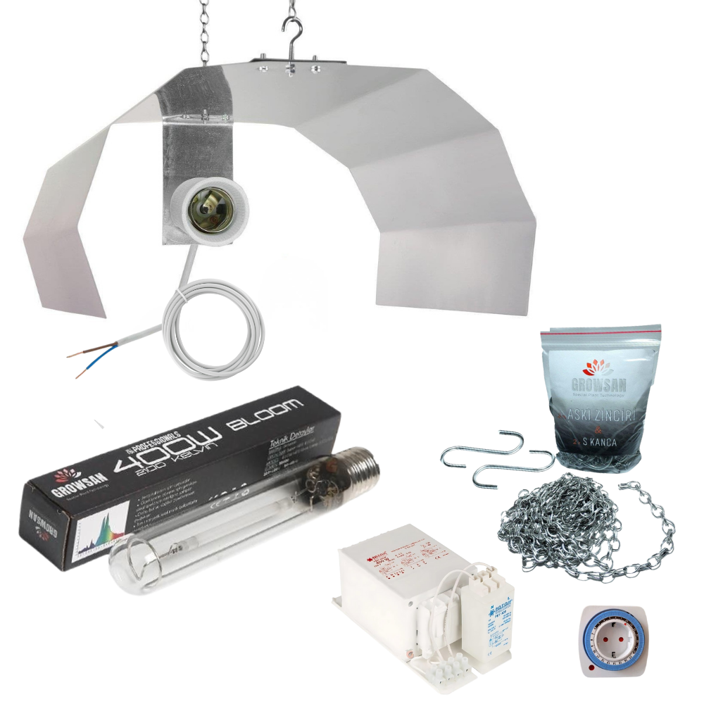 Çalışma Prensibi: Bu set; lamba, balast, reflektör, mekanik zaman saati ve aski zincileri ile kancalardan oluşan tam ve yüksek fonksiyonlu 400w yetiştirme lambası setidir. Balast ana akım elektrik gücünü doğru voltaj değerine optimize ederek lambanın çalışmasını sağlamaktadır. Yetiştirme lambası elektrik gücünü yetişmekte olan bitkiler için uygun ışık spektrumuna dönüştürmektedir. Lambayı tutmakta olan reflektör ise, lambanın ortaya çıkardığı ve kendisine yansıttığı ışık spektrumunu tekrar yetiştirme ortamına yansıtmak suretiyle bahçe verimliliğinizi arttırmaktadır. Zira reflektörden geri yansıyan ışık bitki tarafından kullanılabilecektir.